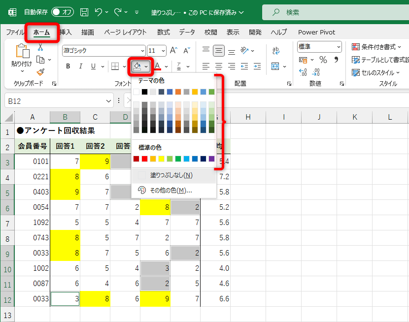 - セルを選択した状態で、Alt → H → H の順にキーを押します。これで「ホーム」タブ内の「塗りつぶしの色」メニューがアクティブになります。