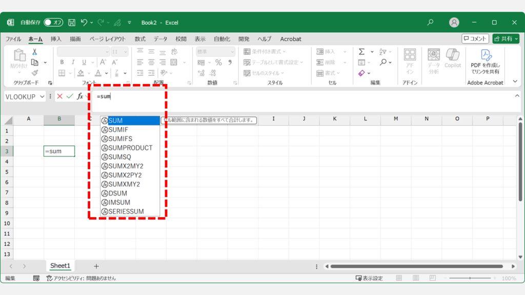 Excelの「オートコンプリート」機能は、数式バーやセルに関数名を入力する際に自動的に候補を表示します。この機能は「ファイル」→「オプション」→「詳細設定」の「数式入力時に数式オートコンプリートを使用する」で有効/無効を切り替えられます。通常はデフォルトで有効になっています。