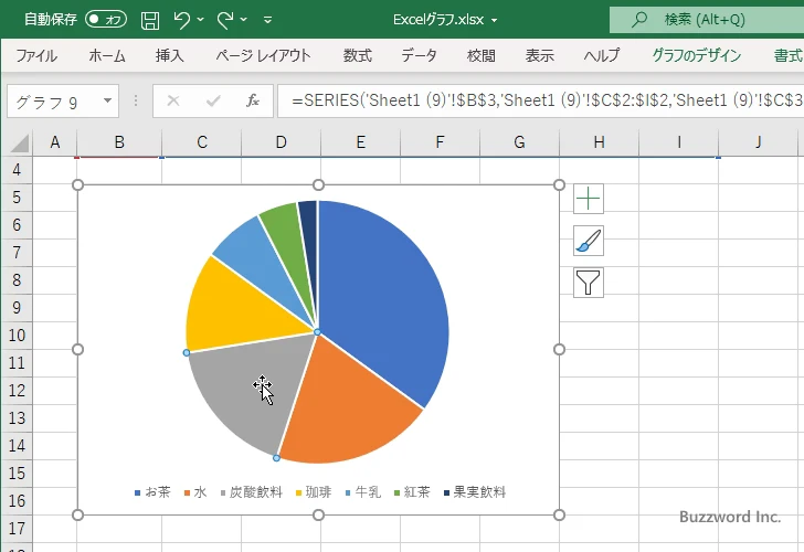 グラフをダブルクリックして編集モードに入り、切り離したい扇形を一度クリックして選択します。次に、その扇形をもう一度クリックしてからマウスを動かすと、グラフの中心から引き離すことができます。離す位置でクリックすると、切り離しが確定します。