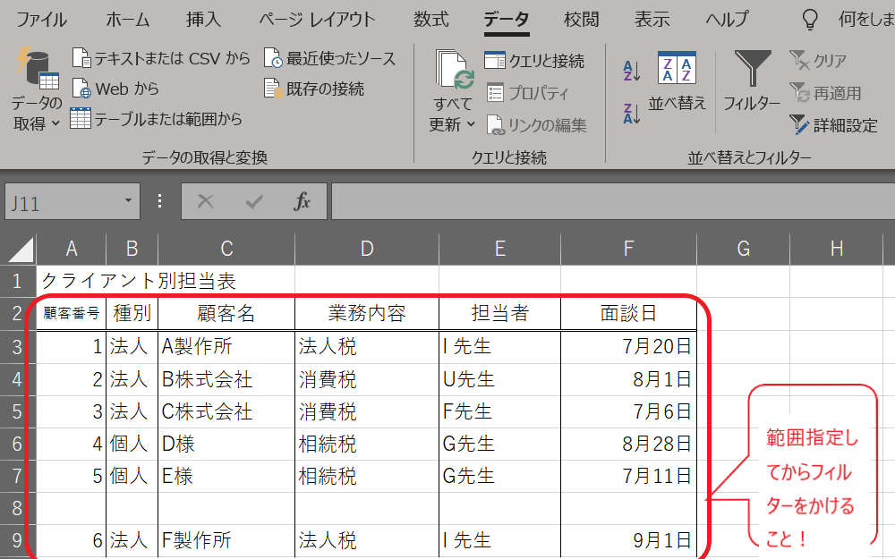 - 範囲選択の誤り: フィルターを適用する前に、Ctrl + A で正しいデータ範囲全体を選択しているか確認しましょう。ヘッダー行を含めることが重要です。