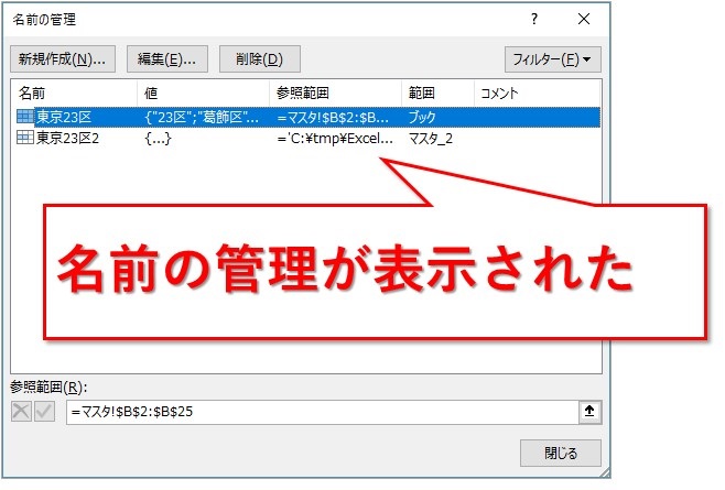 - 表示されるダイアログボックスで、削除したい名前定義をクリックで選択します。