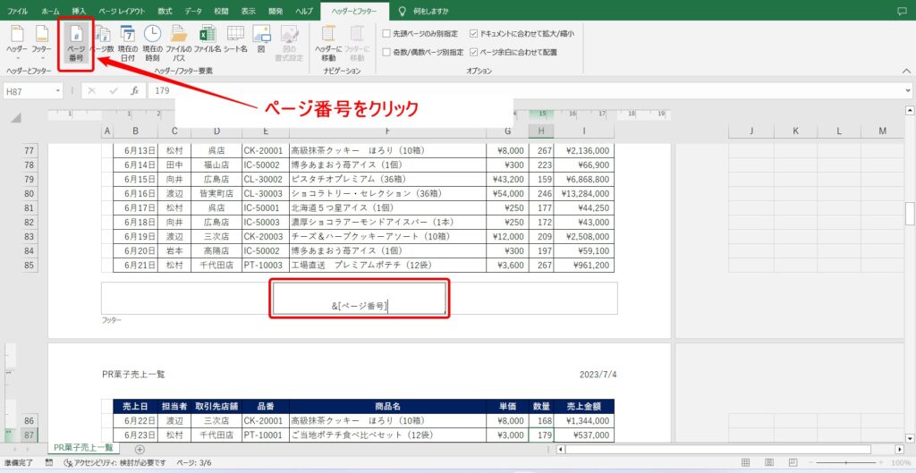 - フッター領域をクリックし、表示される「ヘッダー/フッターツール」デザインタブから「ページ番号」を選択します。