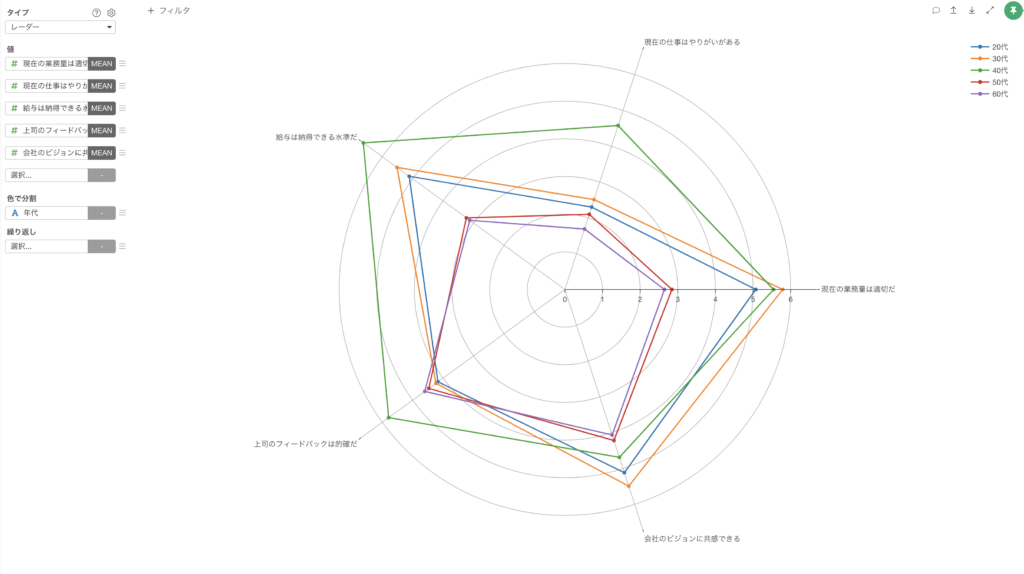 特に項目数が多い場合やデータ値が近い場合、複数のレーダーチャートを重ねて表示すると、線が交差して視認性が大幅に低下します。このため、個々のデータポイントの比較が困難になり、直感的な理解を妨げる可能性があります。